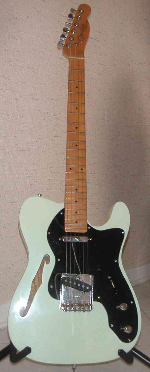 Can't be a Fender because it is a piece of junk. But it does sound great. Ash body has been painted seafoam green. The neck has a maple fretboard laminated to a maple neck, and not a very good lamination job at that. The body was a '72 type of body accommodating two humbuckers and the regular '72 thinline style bridge. Then somebody decided to make it like a '69 thinline. So they drilled holes and added gromets so the '69 style bridge with through the body strings could be added. Problem is that the bridge is just floating over a hole with very little wood underneath. Also, the bridge was placed too close to the neck, so the bridge saddle screws actually sit on top of the bridge screws. The pickguard is a cheap - warped piece of junk cut by a non-expert.
